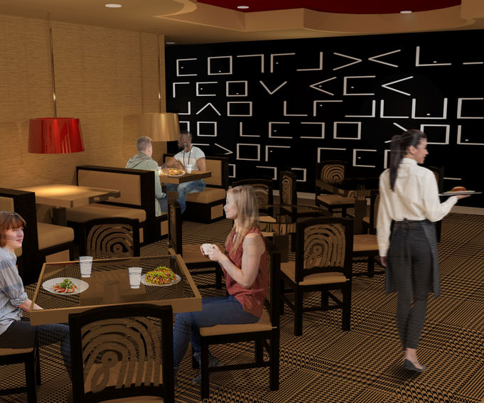 Where does Sherlock Holmes go when he wants a bite to eat? Why "To 'Elementary', my dear Watson." But you don't need to be the world's most famous consulting detective to figure out the theme of this restaurant. Upon entering, guests are greeted at the hostess stand and relax in the question mark shaped seating area while waiting for their table. Solid and resin walls block views to the restaurant, creating a feeling of suspense worthy of any good Hitchcock film. As guests enter the main portion of the restaurant to be seated, they will observe chair backs riddled with fingerprints and glass tables with metal rims that look suspiciously like magnifying glasses. Puzzle piece shaped ceiling features and unique wall art, such as the pig-pen cipher guests can try to crack while waiting for dinner, help to tie the space all together. Oh, and just one more thing, there is a secret dining section behind a door hidden in the bricks on the back wall for guests looking for an exclusive private dining experience!